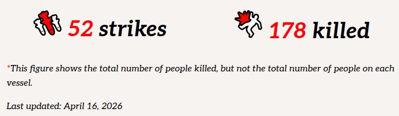 As of Thursday, April 16, 2026, Crime Insight documented 52 strikes by the US military against suspected drug smuggling boats in both the Caribbean and Eastern Pacific, resulting in the deaths of more than 175 people. The map below shows the locations of those strikes.