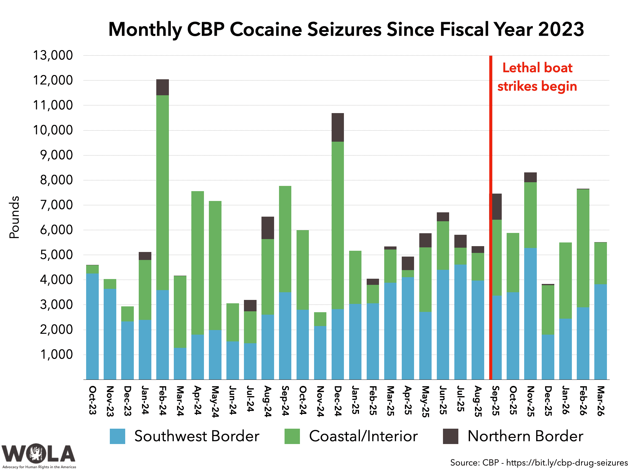 However, a separate analysis by WOLA.org could find “no apparent impact” on the amount of cocaine being seized by US Customs and Border Protection (CBP) since those boat strikes began: