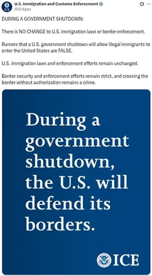 U.S. Immigration & Customs Enforcement (ICE) is among the agencies taking to social media to explicitly state that “Rumors that a U.S. Government shutdown will allow illegal immigrants to enter the United States are FALSE.“