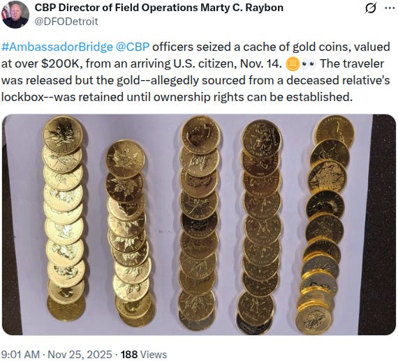 The US citizen carrying the undeclared gold told CBP Agents it had been removed from a dead relative’s lockbox. According to CBP Detroit Director Marty Raybon, the government is waiting for proof of ownership: