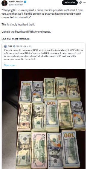 Civil Libertarians - including ex-congressman Justin Amish - who criticized this week’s seizure of $70,000 at Brownsville’s Gateway International Bridge (which led this article) on x.com: