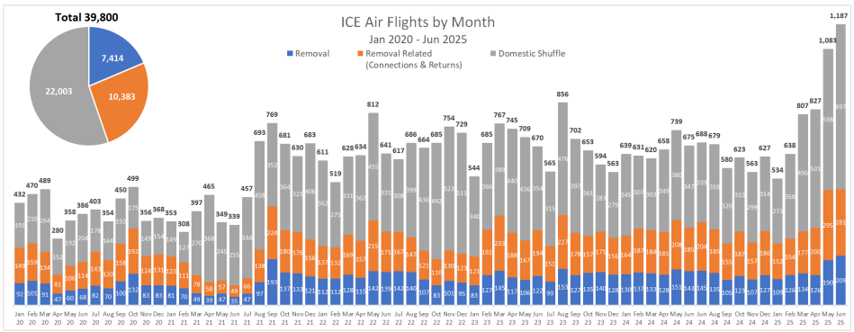 In June 2025, there were 209 removal flights. The prior high was 193 during the September 2021 mass deportation of Haitians, with the next highest month at 153 in August 2023. The June numbers were 54% higher than the average for the prior six months.