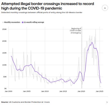 This is sharply down from the high of attempted illegal crossings, which corresponded to the beginning of the COVID-19 pandemic (see chart below):