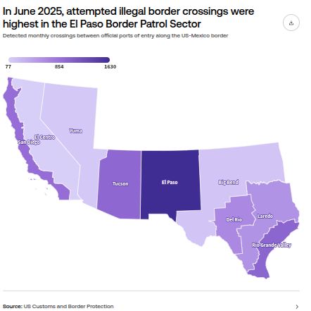 About 6,100 attempted crossings were detected along the US Southern Border with Mexico in June 2025, 92.7% fewer than in June 2024, according to a usafacts.org analysis of US government data.