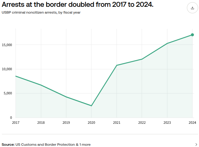 From 2017 to 2024, border arrests DOUBLED (as the chart below indicates)