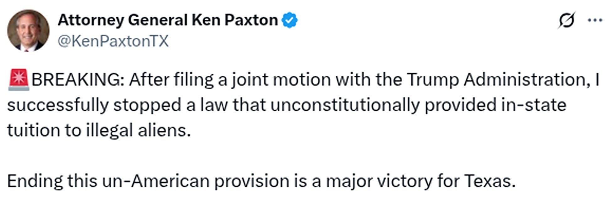 Texas Attorney General Ken Paxton tweeted that he "successfully stopped a law that unconstitutionally provided in-state tuition to illegal aliens."