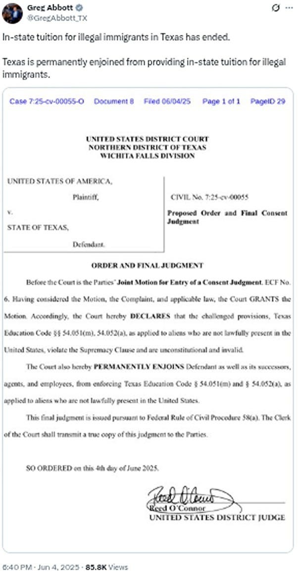 Governor Greg Abbott tweeted that "Texas is permanently enjoined from providing in-state tuition for illegal immigrants."