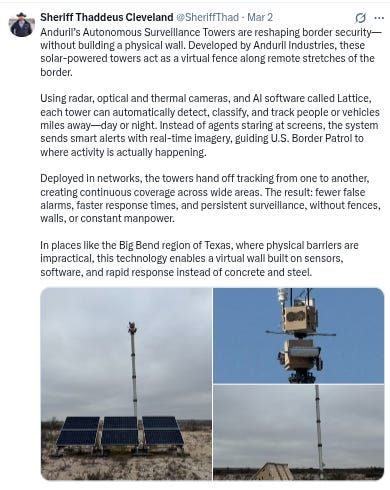 What Sheriff Cleveland (and others like him - who we’ll get to in a moment) want instead is a “smart system” of ground sensors and video surveillance towers to detect illegal crossing attempts instead of a “dumb” border wall: