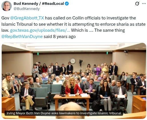 If this dust-up over North Texas “Sharia Courts” sounds familiar, Fort Worth Star-Telegram columnist Bud Kennedy pointed out the reason for that in a post to x.com.