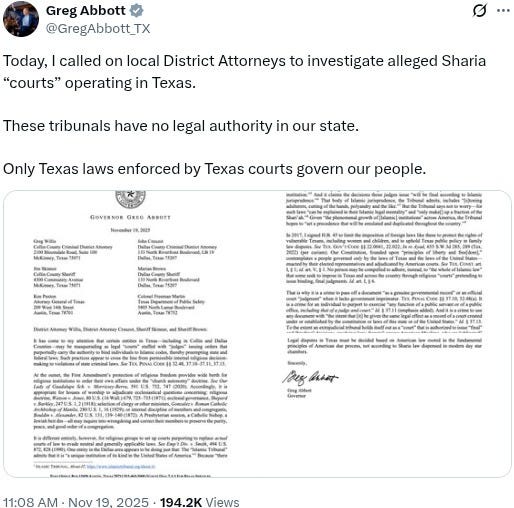 The Governor explained his reasoning in the letter as well as in a post on x.com about the “alleged Sharia courts operating in Texas” :