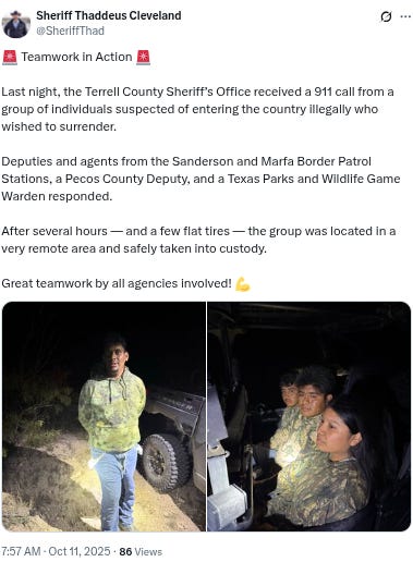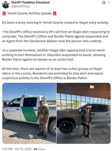 The night before, the Terrell County Sheriff’s Office, along with lawmen from three other federal, state, and local law enforcement agencies, spent hours responding to another 911 call from illegal aliens requesting rescue from a highly remote area:
