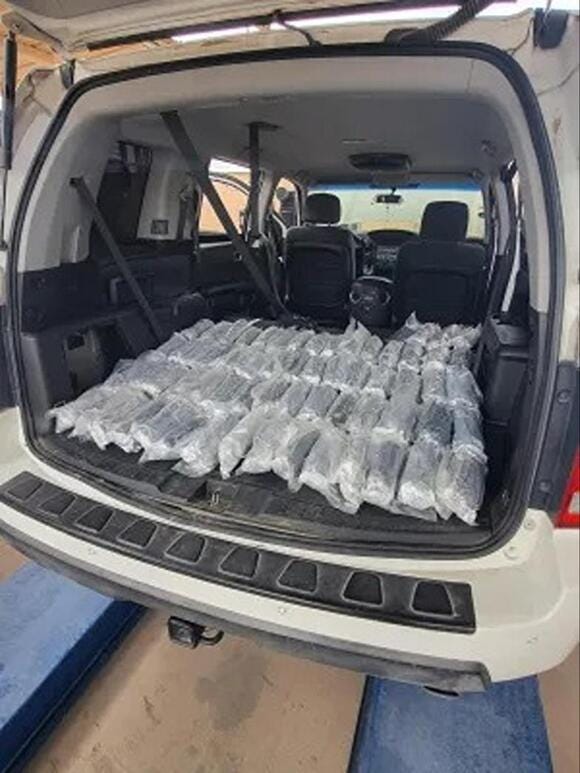 As they inspected a car arriving from Matamoros, Mexico driven by a US Citizen they discovered some suspicious packages - 43 in all - which contained more than 124 pounds of meth worth 1.1 million dollars.