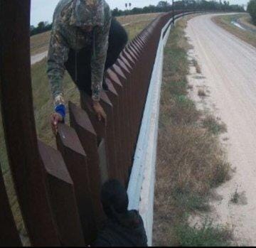 This image shows a man climbing over the "Border Wall" as another man - who has also illegally crossed the border from Mexico - waits for him on the Texas side below.