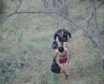 That photo shows two men who have stripped down to their underwear sprinting through Texas ranchland after they've just waded across the Rio Grande from Mexico. The trash bags they are carrying most likely contain a change of dry clothing.