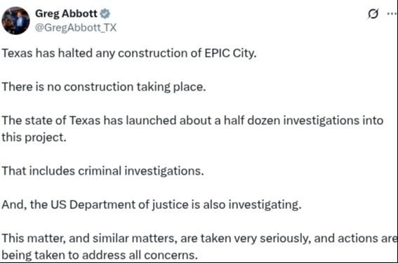 In May 11, 2025, Texas Governor Greg Abbott claimed on x.com that “Texas has halted any construction of EPIC City. There is no construction taking place.”