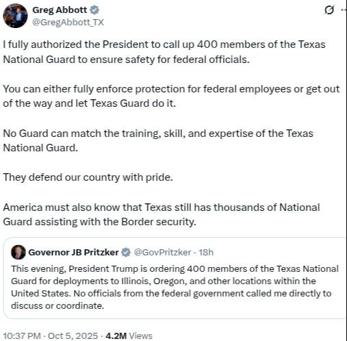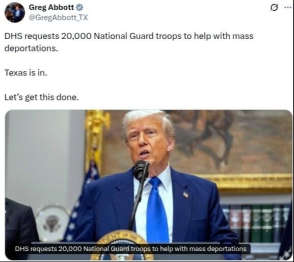 As far back as May 15, 2025, upon learning that the Department of Homeland Security was requesting “20,000 National Guard troops to help with mass deportations,” Governor Abbott replied on x.com that: “ Texas is in. Let’s get this done.”