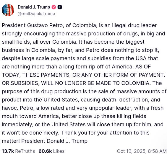 The latest deadly strike - in international waters off Colombia - will likely further fuel a red-hot diplomatic situation between the US and that country. In reaction to the Colombian President’s complaints on October 19, 2025, President Trump called the Colombian President “an illegal drug leader” and cut off all US aid to that country: