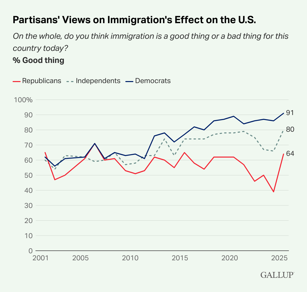 Gallup says the recent jump in perceptions of immigration being a good thing is largely owed to a sharp increase among Republicans and, to a lesser extent, independents. These groups’ views have essentially rebounded to 2020 levels after souring in the intervening years.