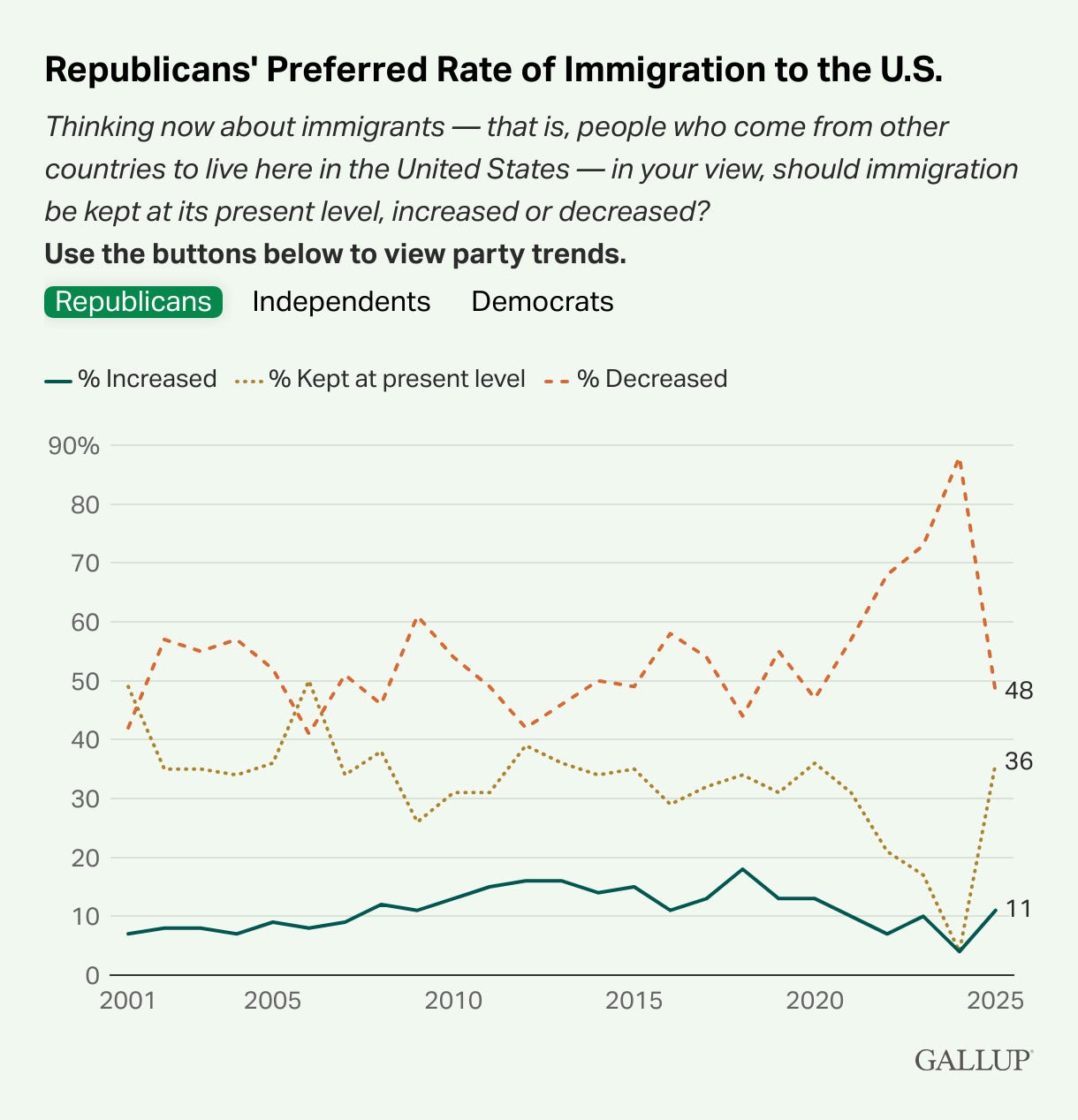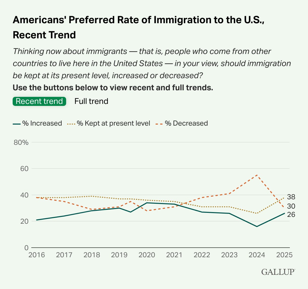 30% of Americans want immigration decreased, down from 55% a year ago