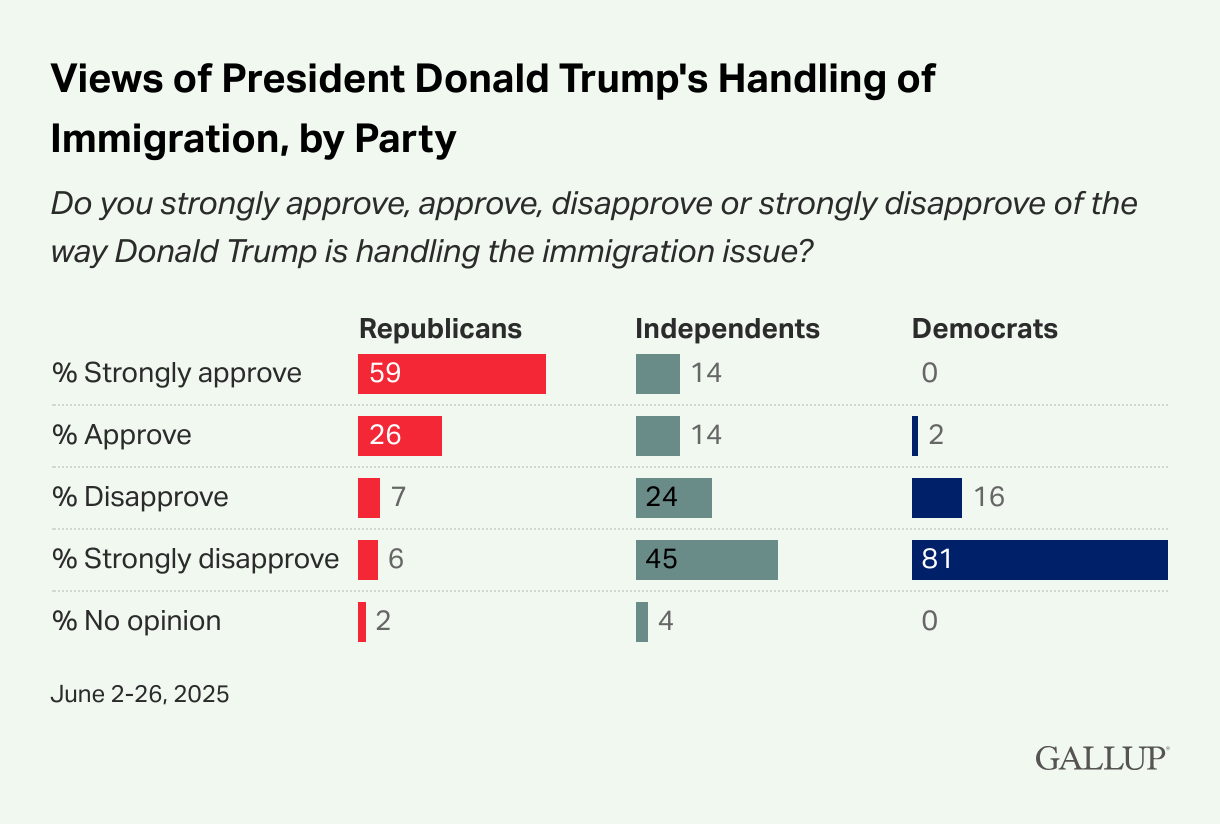 Gallup notes that these views are sharply partisan: 85% of Republicans approve of Trump’s handling of immigration, compared with 28% of independents and just 2% of Democrats. Notably, 81% of Democrats strongly disapprove, while 59% of Republicans strongly approve. Independents are much more likely to strongly disapprove (45%) than to strongly approve (14%).