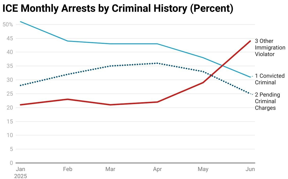 This public opinion shift occurs as US Immigration & Customs Enforcement (ICE) has stopped prioritizing the arrests of illegal aliens with criminal histories (“The Worst, First”) over those with no criminal record, to meet arrest quotas demanded by White House Deputy Chief of Staff Stephen Miller and Secretary of Homeland Security Kristi Noem (see chart below).